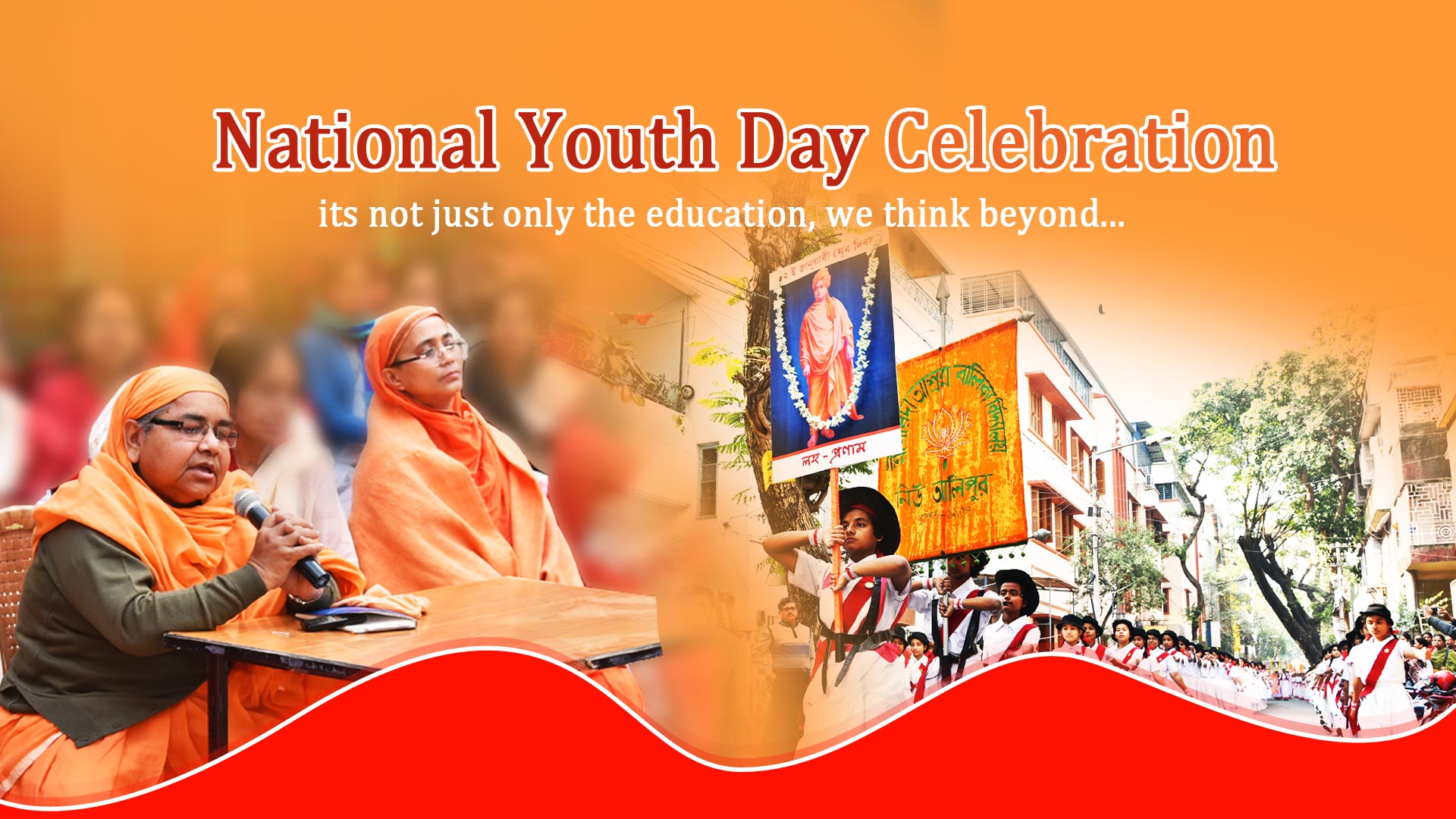 School celebrates 12th January, the Birthday of Swamiji in a pompous manner. Ashrama arranges various programmes to inculcate the dream of Swamiji for a healthy society in the pupil’s mind. A long procession followed by the march past, songs, music and banners proceeds from school towards New Alipore Petrol Pump where the statue of Swamiji is located to salute the image.